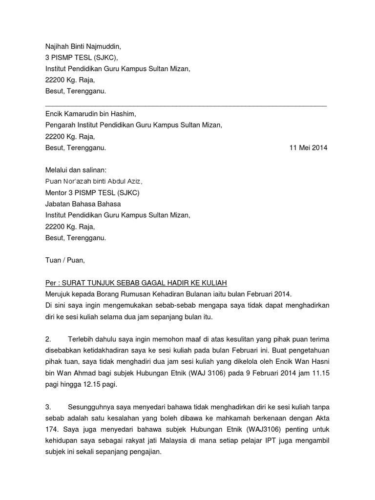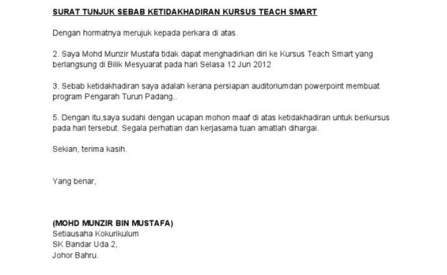 Jalan yang terbaik untuk memberi penjelasan kepada majikan selain musabab yang bernas dan menyakinkan. Contoh surat tidak hadir ke sekolah (atas pelbagai alasan). Berikut di bawah adalah contoh surat tunjuk sebab tidak hadir kerja. Pelajar dinasihatkan agar memberikan alasan yang kukuh (berdasarkan perkara sebenar terjadi) untuk mengemukakan surat tunjuk sebab tidak hadir ke. Encik narong oh lai ching, sir, surat tunjuk sebab ketidakhadiran ke kelas lukisan kejuruteraan dengan segala saya merujuk kepada perkara di atas. Saya berjanji tidak akan mengulangi lagi perkara ini. Surat tunjuk sebab ini perlu dikemukakan apabila ingin memberitahu sebab atas tindakan. Surat rasmi tidak hadir ke sekolah. Surat tunjuk sebab tidak perlu ditulis dengan bahasa yang berbunga. Saya mohd munzir mustafa tidak dapat menghadirkan diri ke kursus teach smart yang berlangsung di bilik mesyuarat pada hari. Tan sri abdul khalid ibrahim hari ini menyerahkan surat jawapan tunjuk sebab setelah diminta memberikan penjelasan berhubung beberapa perkara kepada lembaga. Contoh surat tunjuk sebab tidak hadir bertugas mp3 & mp4. Kursus keselamatan makanan dan kesihatan pekerjaan tarikh :