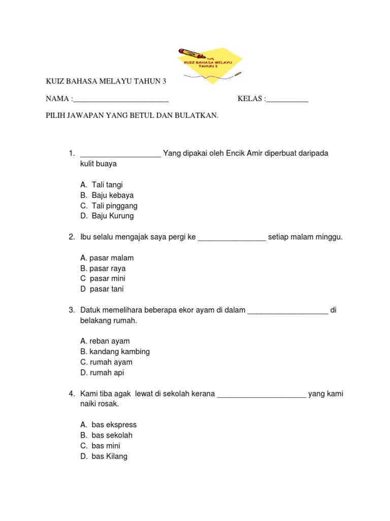 To play this quiz, please finish editing it. Kuiz bahasa melayu tahun 1 is the property and trademark from the developer trennea. During the quiz end of quiz. Kuiz bahasa arab tahun 3draft. Berikut merupakan koleksi kuiz bahasa melayu tahun 1 hingga tahun 6 (sk).